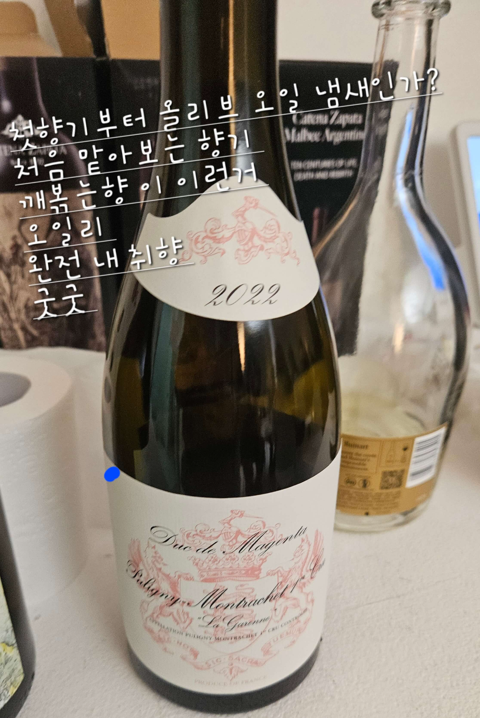 Puligny-Montrachet 프리미에 크뤼 지역에서 법적으로 인증받았다는 의미랍니다. 부르고뉴 와인은 이런 원산지 통제가 꼼꼼해서, 라벨만 봐도 어디서 어떻게 만들었는지 감이 옵니다.